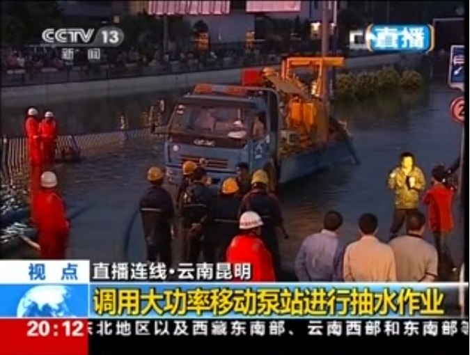據(jù)央視7月19日“東方時(shí)空”新聞報(bào)道,從2013年7月18日早7點(diǎn)開(kāi)始,云南昆明市降下了近4年以來(lái)最大的暴雨,12小時(shí)降雨量達(dá)190毫米,城區(qū)多處積水,交通受到嚴(yán)重影響。流經(jīng)城區(qū)的盤(pán)龍江流量是正常時(shí)期10倍左右,水位大幅上漲,導(dǎo)致江水倒灌。緊靠盤(pán)龍江的火車(chē)北站隧道是市區(qū)最大的淹水點(diǎn),這條長(zhǎng)300多米的汽車(chē)和行人通道積水20000立方米左右,最深處達(dá)5米。昆明市排水公司調(diào)來(lái)了全市唯一一臺(tái)大功率移動(dòng)排水泵站投入搶險(xiǎn),經(jīng)過(guò)一夜的連續(xù)工作,在早高峰前排清了積水,恢復(fù)了該城市主干道交通。
